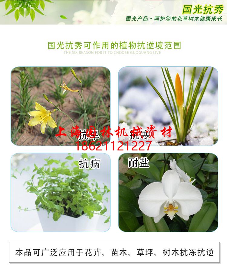 “國光抗秀+”,抗秀擁有核心戰(zhàn)斗力,其主要成分S-誘抗素,是誘導抗性基因表達的關鍵因子。在近兩年的實踐應用中,“國光抗秀+”類國光冬保護系列產(chǎn)品(如抗秀+潤爾鉀,抗秀+保溫保濕帶,抗秀+液態(tài)膜等),在預防冬季植物“風抽水”導致的半冠干枯以及新栽植花木減弱蒸騰,維持樹體水分方面,抗干旱脅迫方面以及在增強植物抗性,預防和減弱低溫傷害、防倒春寒等方面都有著較好的應用效果。